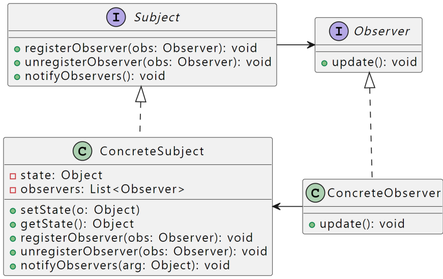 위 그림에서 볼 수 있듯, Subject에서 Observer를 등록 또는 해제하고, 객체의 상태가 변경되어 옵저버에게 알려야 할 내용이 있다 notifyObservers()를 통해 옵저버에게 객체의 변경 상태를 알려줍니다.