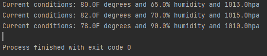 위의 main()이 포함된 WeatherStation클래스를 실행하면 아래와 같이 실행되는 것을 확인할 수 있습니다.